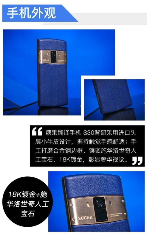 整体来看,糖果翻译手机S30可以说是独具特点,在同质化的手机设计上彰显自己独特的个性,奢华的小牛皮背部主体,辅以人工宝石和18K镀金,非常吸引眼球。