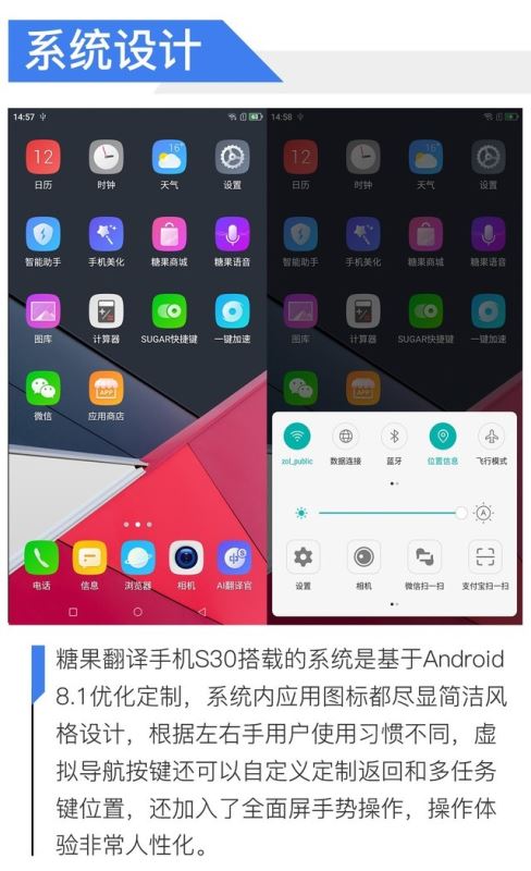 除了独立的两个翻译按键外,糖果翻译手机S30还设置了SUGAR快捷键,可以自定义短按和长按的手势,快速启动例如微信扫一扫等功能,操作更加方便快捷。