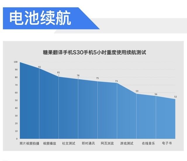 糖果翻译手机S30支持9V/2A,最高18W的快充技术。经过5小时的重度续航测试之后,糖果翻译手机S30的剩余电量还有52%,看来4000mAh的大电池,让糖果翻译手机S30在续航上非常具有优势,满足用户的重度使用需求。