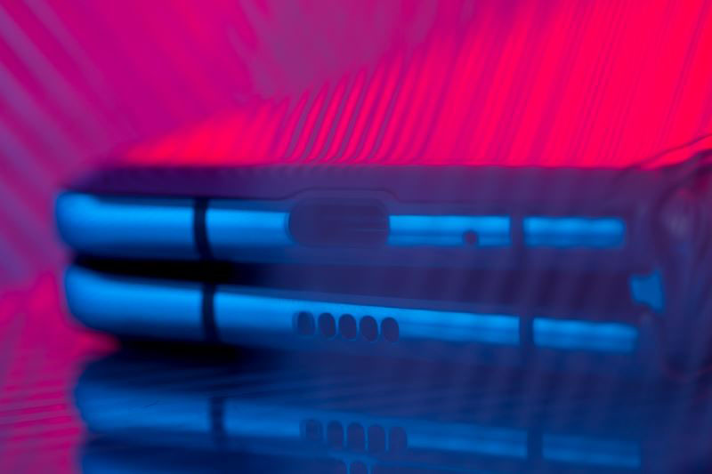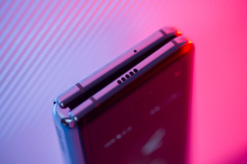 搭载上下对称双扬声器,Type-C 接口,三星这个折叠屏就是依靠图上那个转轴来实现的,官方称为“精密的铰链”,据说灵感来源于机械表,铰链外还有一个三星 LOGO,不同光线下能折射出五颜六色的色彩。