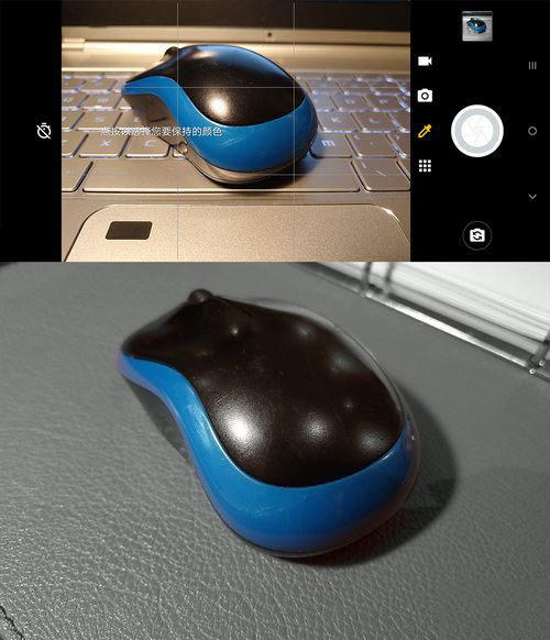 进入专色模式,用户可以在拍照中通过点击来选择画面中想要保留的颜色,比如上图中我们选中了蓝色,作为背景的棕黄色皮纹笔记本就转为了灰度图像,整个画面只有蓝色一抹亮色,起到了非常好的突出重点的作用,而且在使用中用户也可以对保留颜色的宽容度进行调节,做到更细致的色彩分离。