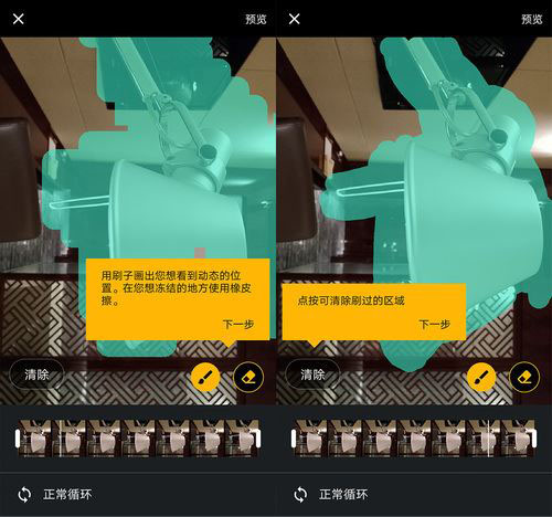 微动摄影则要更专业,可玩性也更高一些,用户在长按拍摄一小段动态图像后可以对其进行编辑,通过涂抹和擦除两个工具来确定画面中会产生移动和相对固定的部分。