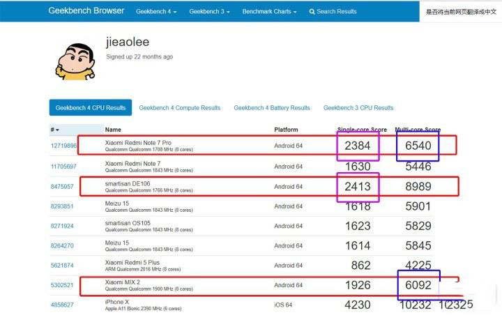 个人GeekBench表单中查看历史实测机型,骁龙675的单核处理能力几乎平了845(DE106/坚果R1)。多核性能也超过了曾经不可一世的835(Mi MIX2)。