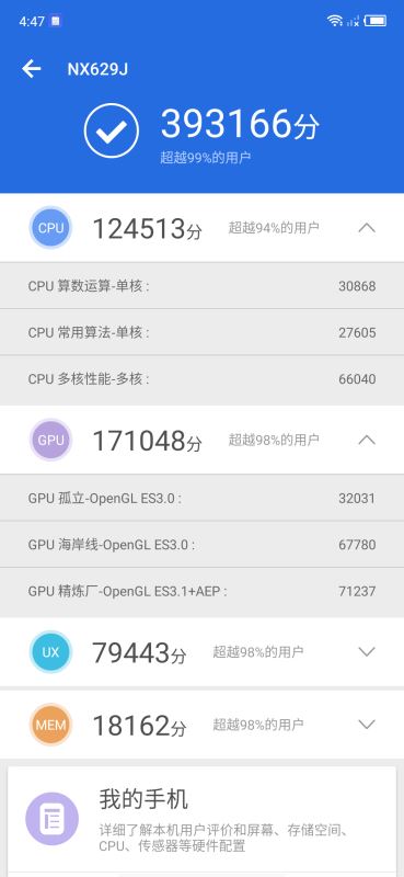 又是喜闻乐见的安兔兔跑分环节,发布会公布的实验室跑分达到了43万分,小编在现场跑分成绩为39万分也达到了骁龙855的较高段位。
