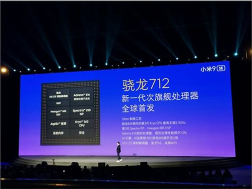 小米9se采用了一颗骁龙712处理器,该处理器拥有10nm制程工艺,有着与骁龙845相同的第三代Kryo CPU,最高主频可以达到2.3GHz,GPU则为Adreno 616处理器,图形处理性能有着12%的提升,AI运算能力也比骁龙660提升了2倍。