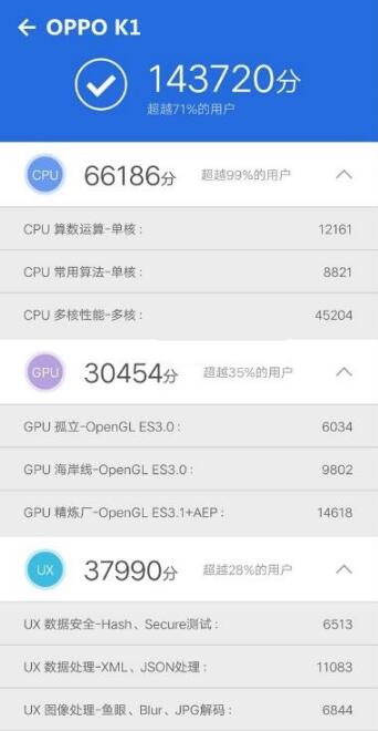 而OPPO K1搭载了一代神U骁龙660移动平台,加上4GB/6GB+64GB存储组合,一块容量为3600mAh的电池完全可以满足日常的使用需要。无论是游戏还是日常使用都毫无压力。如下图为OPPO K1跑分成绩: