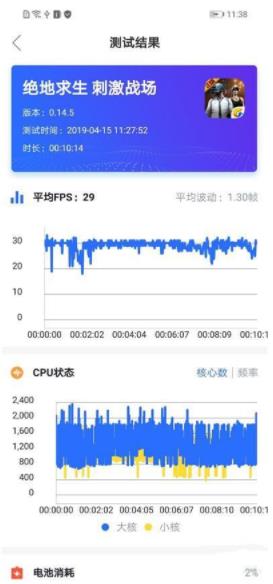 测试后,我们可以看到荣耀20i玩吃鸡的平均帧数为29fps,仅仅只波动了1.30帧,CPU也没有出现降频等状况。