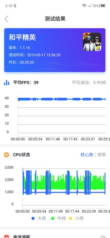从99%电量开始,游戏60分钟,剩余电量84%,消耗电量15%,照此预估,在这种测试环境下,玩《和平精英》差不多可以持续6到7个小时左右。