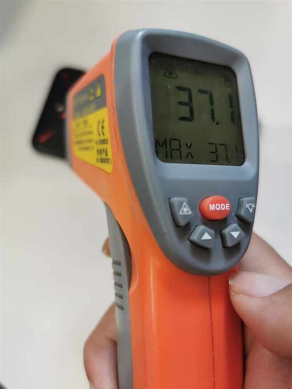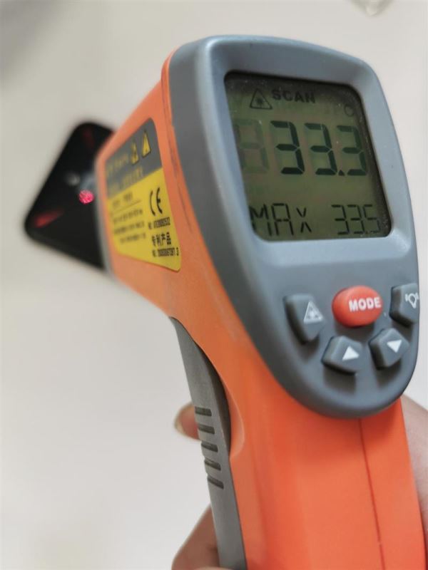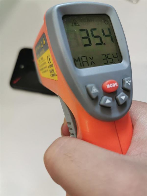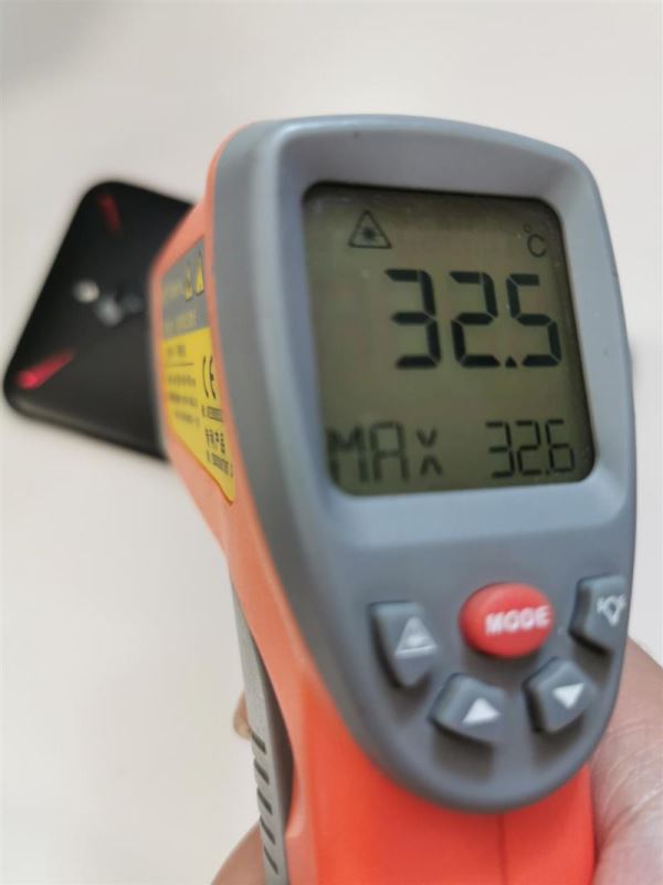 环境室温恒定在31度左右。我们使用红外温枪,测量《和平精英》游戏过程中机身上半部分手部握持之处的温度,每10分钟记录一次,来观察这以风扇为主的散热系统究竟能起到什么作用?