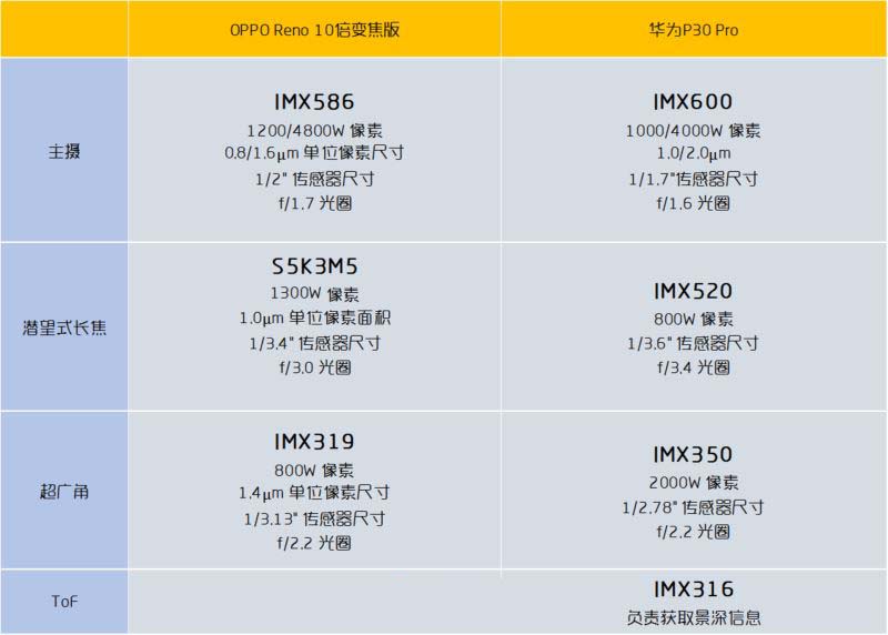 Reno 10 倍变焦版背部一共有 3 颗摄像头,4,800 万像素主摄 + 1,300 万像素潜望式长焦 + 800 万像素超广角。华为 P30 Pro 也较为类似,4,000 万像素主摄 + 800 万像素潜望式长焦 + 2,000 万像素超广角,以及 1 颗专门用于景深信息的摄像头。