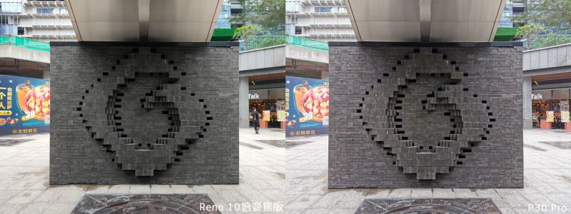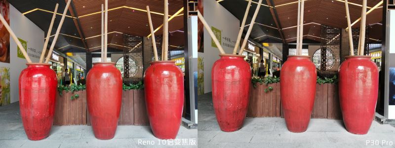 这里同样可以看出来 P30 Pro 的饱和度较高,后面墙体部分依旧偏红,画面有些许泛白。Reno 10 倍变焦版照顾了整体的观感,白平衡更为准确。