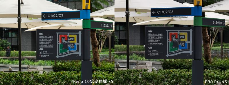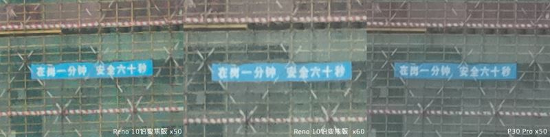 Reno 10 倍变焦版最大放大倍数为 60 倍,P30 Pro 最大放大倍数为 50 倍。