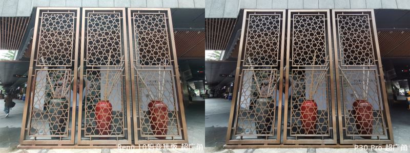 最后来一组超广角对比,这里一眼就可以看区别,Reno 10 倍变焦版曝光更高,暗部细节也更优秀,原因就是 Reno 10 倍变焦版超广角镜头的单个像素尺寸更大。