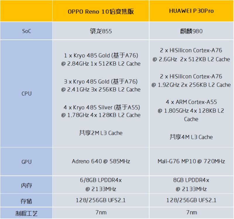 一台手机买回来,就肯定是要用的,而决定整个用户体验的根本,自然就是硬件部分了。Reno 10 倍变焦版搭载骁龙 855 SoC,这是今年高通的旗舰产品,也是目前市面上最强的处理器之一。而 P30 Pro 搭载了华为自家的 SoC——麒麟 980,同样也是旗舰产品。