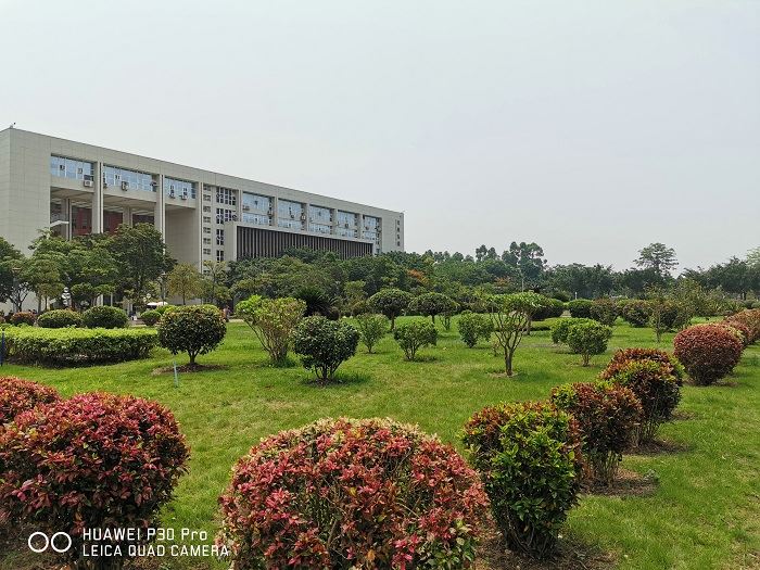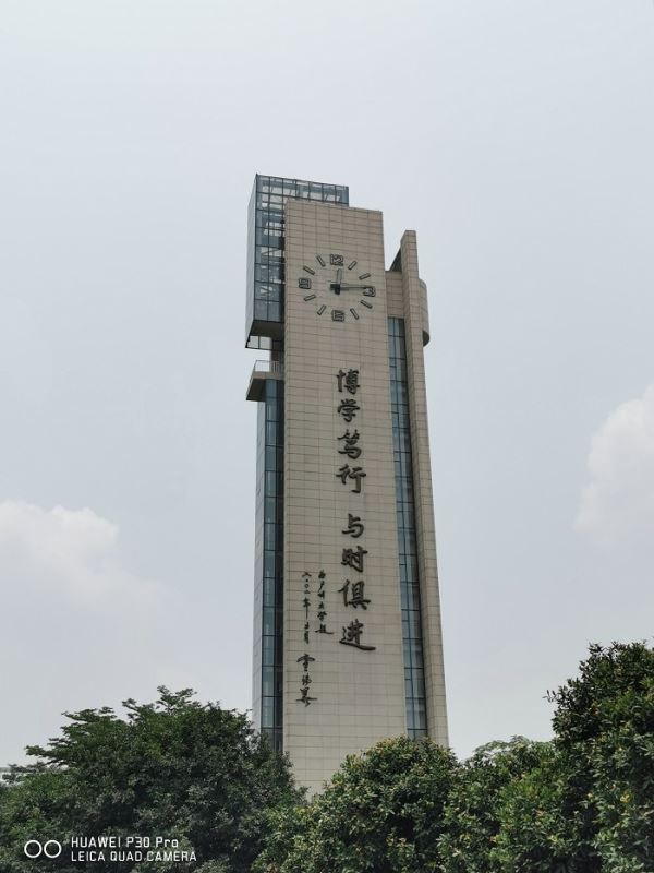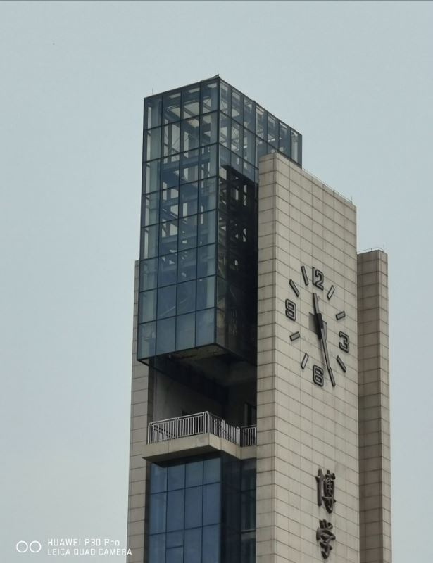 为了能够直观地展现50倍变焦所带来的视觉效果,笔者拍摄了以下两张图。笔者在手机图库中通过放大正常拍摄的原图,可以看清建筑墙面右上角上的中文“行政东楼”,但是隔壁的英文则是模糊的。但是如果在拍摄时,通过50倍数字变焦可以在取景框里直接看到小小的英文字母,拍摄的效果见以下样张。