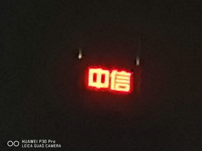 同时,笔者也尝试了在晚上使用50倍变焦的效果,对上一幅夜景照片中的右上部分红色发光物进行拍照。当焦距放大到50倍的时候,取景框的画面非常容易出现抖动,但是拍摄出来的效果令人意外,远处的中信广告牌上的二字被完整的记录下来了。