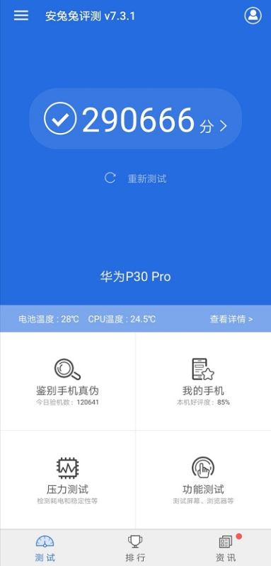 在性能配置方面,华为P30 Pro搭载了一颗7纳米制程的麒麟980,采用三丛集八核心设计,最高主频为2.6GHz,GPU 为Mali G76。华为还宣称搭配了全新升级 GPU Turbo 3.0 技术及SuperCool 超强散热系统,有利于提高游戏性能表现。我手上这台华为P30 Pro在安兔兔评测中的跑分为29万。因为麒麟980是去年10月份发布的,对比高通新的骁龙855于在跑分上肯定不占优势。但是麒麟980是全球首款采用7nm工艺设计的移动平台,性能就算放到现在来看还是属于上流水平。