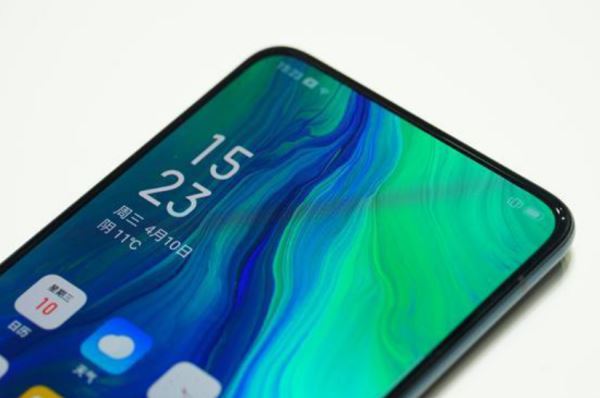 既然同为全面屏手机,那我们首先来对比一下两者的全面屏设计有何不同之处。OPPO Reno有6.4英寸屏的标准版和6.6英寸屏的10倍变焦版两个版本,全景屏无刘海、无开孔,左右边框1.63mm,上边框1.8mm,下巴边框宽度为3.49mm/3.5mm,屏占比高达93.1%,屏幕分辨率为2340*1080,而前置摄像头、柔光灯和听筒等元器件则被集成在侧旋升降式结构中,使用时弹出,用完后收回,极具科技感。