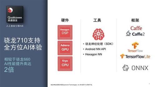 此外,骁龙710还集成了第三代AI平台,但是其并没有内置独立的神经网络单元,而是通过软硬件结合提供一整套AI方案,对Kryo CPU、Adreno GPU、Hexagon DSP三种单元进行了全面优化,从而可以智能灵活的进行AI运算,包括语音识别、拍照等。