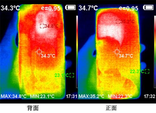20分钟游戏后,背面最高温度34.8℃,位于摄像头位置;正面最高温度35.2℃,同样位于上部,基本与背部位置相当。所以并没有烫手的感觉,只是温热,完全能够接受。