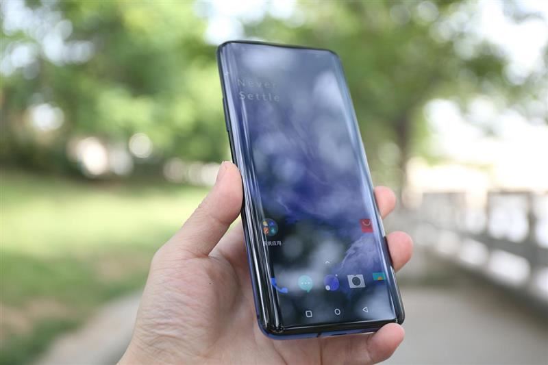 这是背面。单就屏幕边缘的弯曲程度而言,一加7 Pro的正面与背面保持几乎一致的统一,日常握持这种漂亮的弧线也贴合掌心。