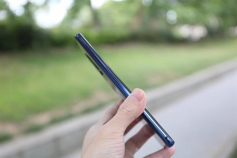 我们所拿到的星雾蓝配色的一加7 Pro机身后背沿用了自一加6时代便成型的磨砂玻璃。在一加7 Pro弧面身上,其又经过了明显的雾度和细腻度调整,出现了流光色泽。