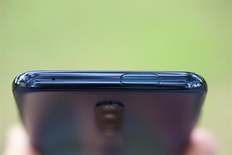机身顶部,机械升降结构部分与周遭机身之间并不存在明显的色差,一体感还是十分强的,并且这个角度通常也不用来示人示己。另外一加手机自一加6T开始便取消了3.5mm耳机接孔,一加7 Pro将之延续下来。