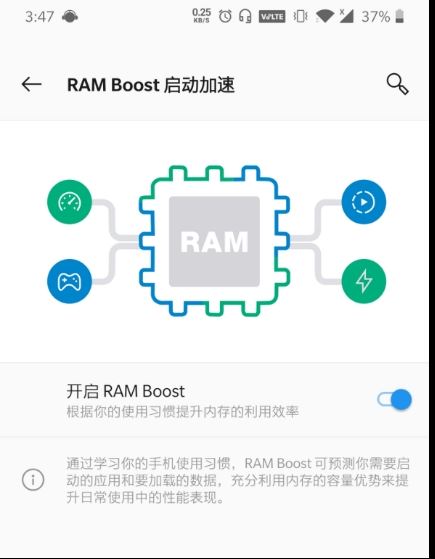 关于RAM Boost是由此前的Smart Boost升级而来,可分为两方面。一方面是RAM为常用应用、即将需要加载的数据单独划分一部分区域,其能保证安全不被杀死且不会有别的程序占用导致内存不足出现性能降低的情况。