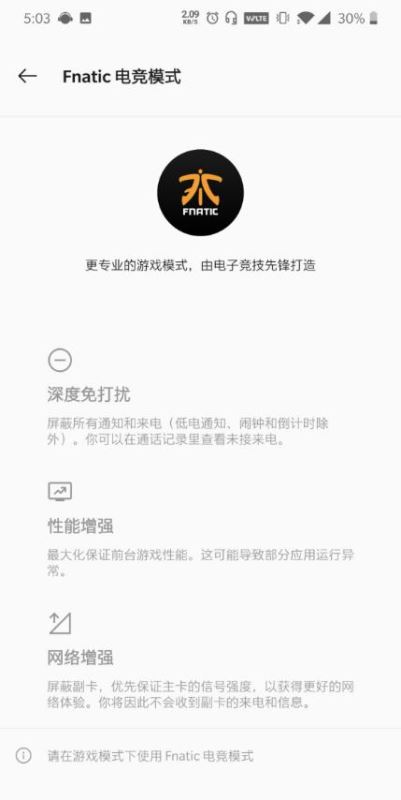 相比较前代,一加7 Pro针对游戏模式进行了升级,新加入的是Fnatic电竞模式,进入游戏开启该模式就能阻挡来电和通知,最大化保证前台游戏性能。