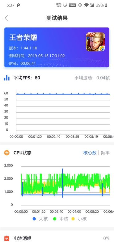 《王者荣耀》众所周知是长盛不衰的热门MOBA手游,这里笔者在游戏设置中打开高帧率模式,多线程优化、高清画质,最高画质。可以看到,一加7 Pro的表现非常稳定,画面帧数一直维持在60帧上下,只有0.04帧的极其微小波动。
