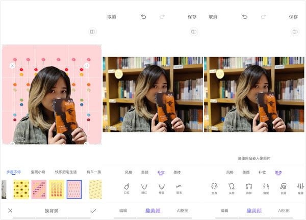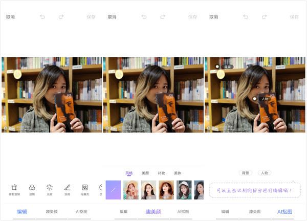 这项功能十分强大,从基本的滤镜剪裁、到人像抠图更换背景都能够完成。不仅如此,拍照时没化妆也不要紧,一键美妆来帮你。补妆功能支持对妆容细节精细化处理,效果自然精致。