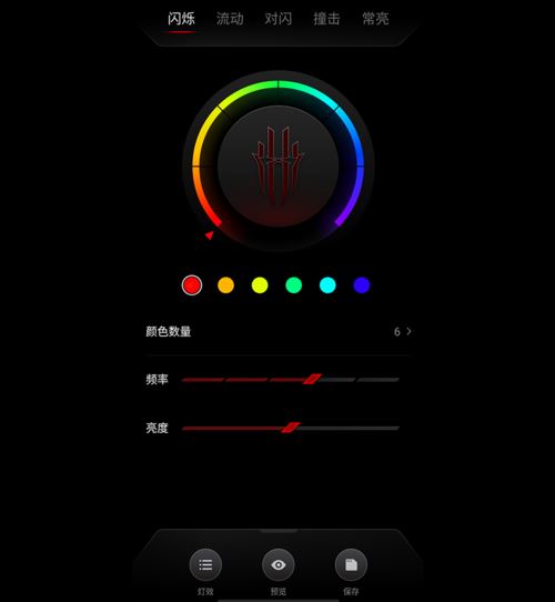 顶部为闪光灯和4800W像素摄像头,底部对应位置则是红魔信仰标志灯,可以设定为常亮或呼吸效果,LOGO上方是整条的RGB灯带,且这次红魔3还配套了自定义选项更加丰富的炫彩灯效控件,RGB YES!