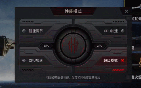 在一键入魔进入游戏空间后,玩家可以对性能发挥进行不同调教,分为智能调节/GPU加速/CPU加速/超级模式4种,分别对应不同场景,当然你也可以放到智能调节让手机自己来进行调度。