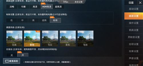 实测环境为吃鸡手游和平精英,画质开启如上:HDR高清+极限帧率(锁帧60fps)+鲜艳画质+抗锯齿开+阴影开+流畅自适应关闭。