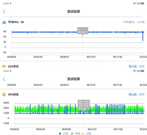 游戏全程使用快否记录游戏帧率,结果表现优秀,游戏最低帧都达到了54fps,帧率曲线全程基本是紧贴60fps数据线在走,而同步核心频率也能看到,超大核调度反应迅速,在保证游戏流畅性的同时也兼顾了能耗表现。