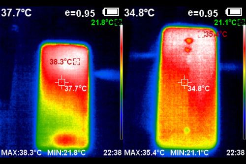 而反映到温度上就更为直观了,游戏过程中红魔3正面最高温38.3℃,背面最高温35.4℃,都维持在一个较好的发热控制范围,在游戏表现突出的同时能有如此表现,风冷+液冷的散热体系作用明显。