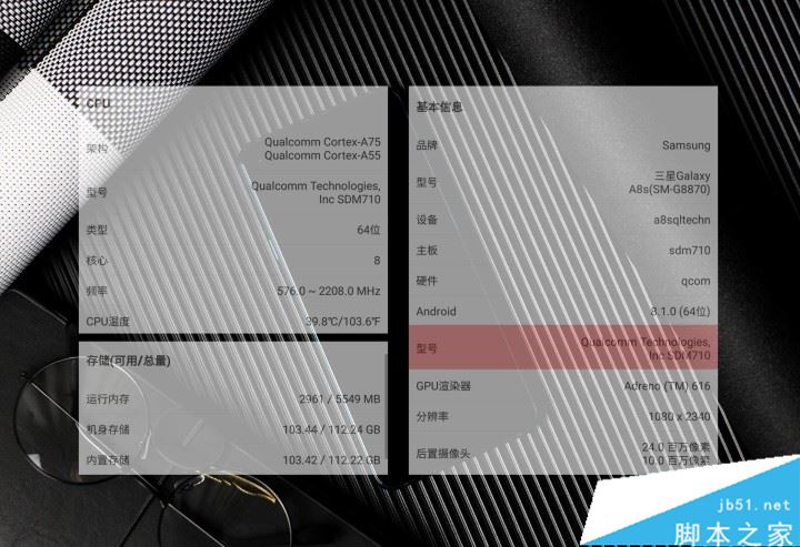 三星Galaxy A8s搭载高通骁龙710移动平台,其性能在骁龙660和骁龙845之间,采用10nm制造工艺,基于高通Cortex-A75的Kryo 360自主构架打造;Adreno 616 GPU(图形处理器);14位Spectra 250 ISP相机模块,支持最高3200万像素拍照以及4K高清视频拍摄。笔者这台三星Galaxy A8s是6GB运存+128GB机身存储,基本可以满足日常需求。