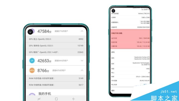 在安兔兔跑分中的EME是手机存储的跑分,笔者这台三星Galaxy A8s是6GB运存+128GB机身存储,EME跑分8766分,而笔者手中的那台魅族Note9的EME跑分14112分,差距貌似很大。