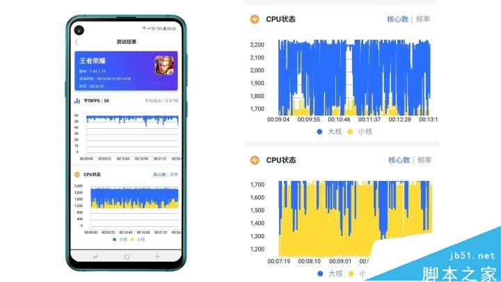 效果全开的游戏画面清晰、颜色也比较艳丽。一场接近27分钟的对局,FPS平均值59,平均波动不到1帧,在多人团战时也没有出现明显的掉帧、卡顿的现象,一般稳定在58-60帧。从上图看出,整场游戏中,CPU的两颗大核心(最高频率2.2GHz)和六颗小核心(最高频率1,7GHz)基本都在满载工作,大核心工作频率1.7GHz~2.2GHz之间,小核心1.1-1.7GHz。