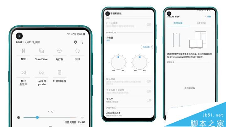 在下拉菜单中,除了常用的开关WiFi、调节亮度、手电筒、GPS定位开关等功能外,还有几个有用的功能。比如杜比全景音音质和音效的调整,SMART VIEW投屏功能,NFC功能,红包加速器等。