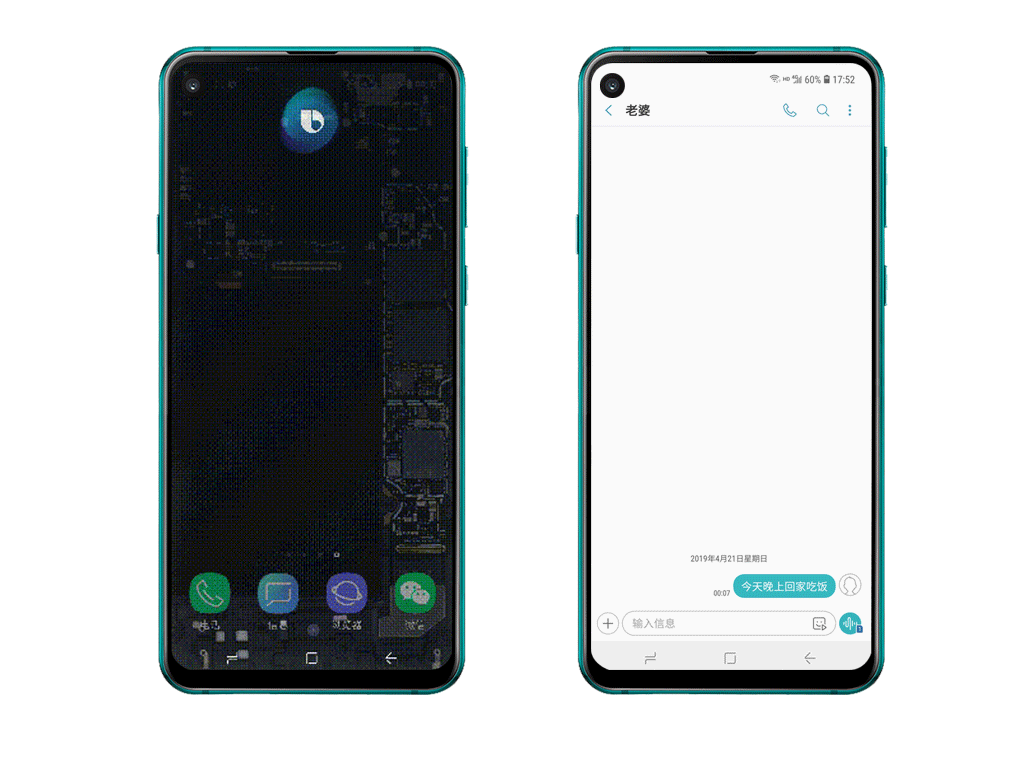 单机手机左侧的语音助手键即可激活Bixby智能语音助手。讲真,Bixby是笔者在安卓机中用过唯一一款可以和Siri相媲美的语音助手,对语音的识别很精准,而且可以识别复杂的语音指令。比如,“给老婆发送信息说今晚上回家吃饭”在魅族Note9中的语音助手,只能识别“给老婆发信息”这部分;而Bixby可以识别整条复杂的语音指令,并且无需前置的固定口令激活语音助手,说出需求就能直接识别。