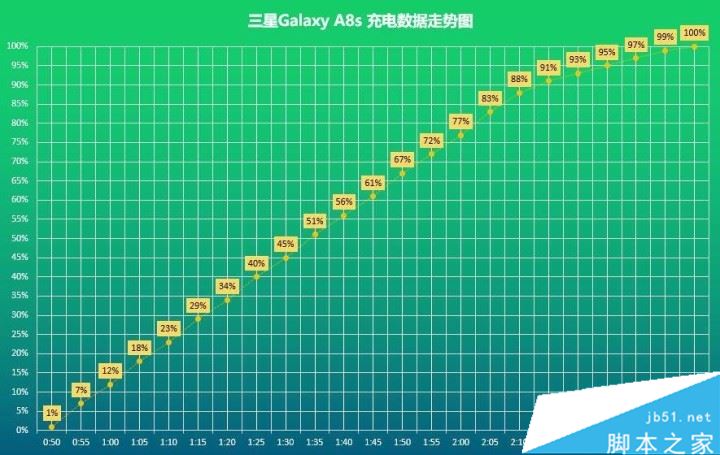 三星Galaxy A8s的电池容量为3400mAh,电源适配器输出功率9.0V⎓1.67A或5.0V⎓2.0A,理论最高输出功率15W。笔者从1%开始充电,每五分钟记录一次电量,充电数据图如下: