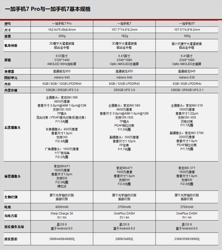 我们不妨来看看一加手机7、一加手机7 Pro以及一加手机6T的基本配置,可以看到一加手机7与一加手机6T的主要区别是处理器、内存、内置存储和摄像头模组有作出升级,但整体来说是属于稳健型的平滑升级,没有太多让人惊喜的地方;而一加手机7 Pro的升级内容就多很多了,几乎方方面面都作出了大改变,新的90Hz流体屏以及三摄系统带来的吸引力显然比一加手机7要更高。