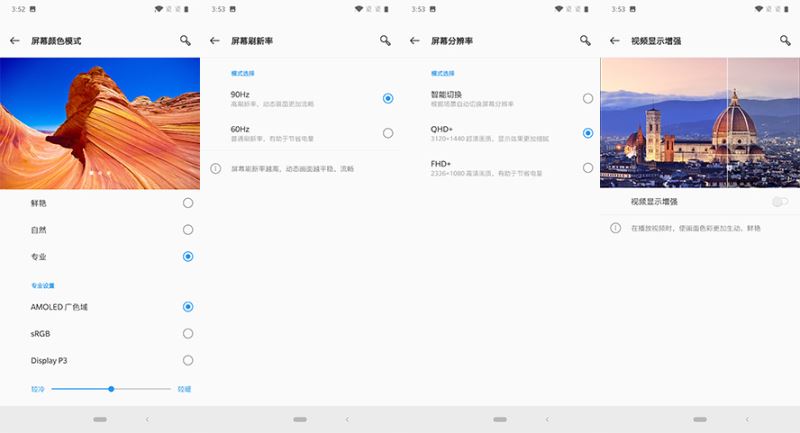 看完关于一加手机7 Pro的90Hz刷新率屏幕与一加手机6T的60Hz刷新率屏幕有在流畅度上有什么区别后,现在我们来看看前者的硬件性能。一加手机7 Pro在显示设置上提供率比较丰富的选项,除了屏幕颜色模式外,还提供有屏幕刷新率、屏幕分辨率的设置项目,甚至还给出了视频显示增强功能的开关,玩家可以根据自己的需要来进行选择。