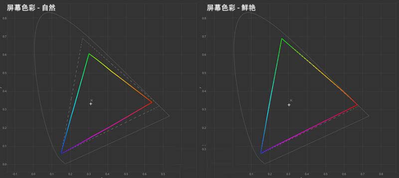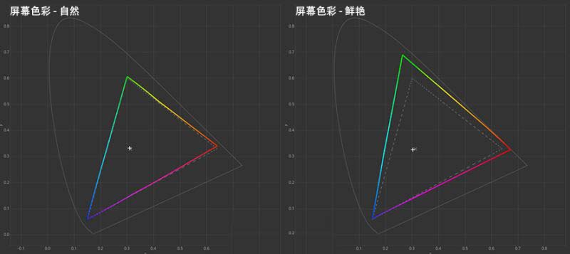 首先在色域方面,对比sRGB色域,一加手机7 Pro的屏幕色彩模式设置为自然时,色域覆盖和色域容积分别为96.3%和98.9%;而屏幕色彩模式设置在鲜艳时,色域覆盖和色域容积则为99.6%和140.9%,可以看出当色彩模式设置为鲜艳时,一加手机7 Pro可以展现出更多的色彩。