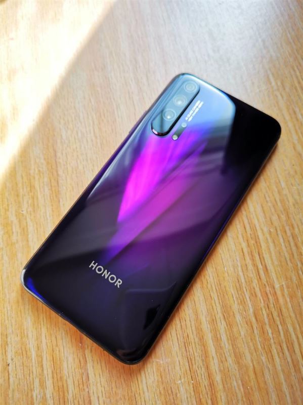 荣耀20 PRO的背部设计非常值得一提,荣耀20 PRO的背部以反光区域为中心向外逐渐扩散渐变,就笔者手中这台来说,其反光中心为粉色,向外稍远则由粉变紫,而再远又会变为蓝色。