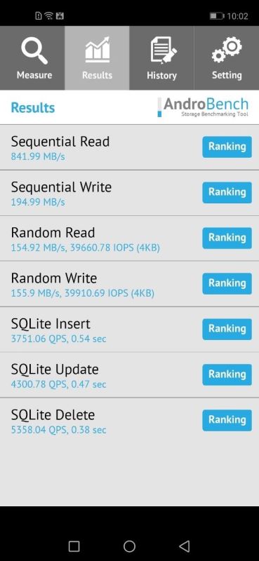 笔者手中的荣耀20 PRO是8+128GB版本,但由于我们拿到的是工程机,无法安装任何跑分软件,所以这里只能用AndroBench测试一下荣耀20 PRO的闪存速度。