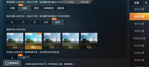 骁龙710的表现我们都已经非常熟悉了,驾驭高清版本王者荣耀仍有余力,所以直接使用刺激战场作为测试环境,为了加强负载以及获得更高帧率体验,实际测试设置如上图所示:均衡画质+极限帧率(锁帧60fps)+鲜艳+抗锯齿开+阴影开+流畅自适应关。