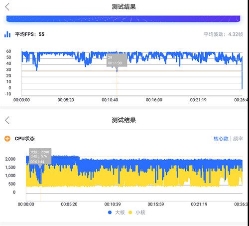 游戏过程使用快否记录游戏帧率,可以看到在2分钟跳伞之后至最后决赛圈阶段,游戏帧率虽然波动不小但基本保持在45-60fps之间,最低帧率也达到了29fps,流畅性方面是没有问题的,不过开始跑满2.2GHz的大核在5-6分钟之后主频降低为2.0GHz左右,这点与帧率波动相对应。