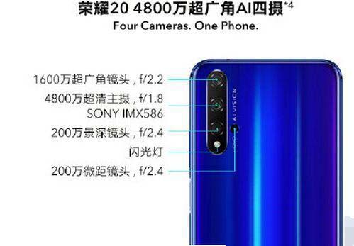 在荣耀20上,长焦被换成了200万景深采集相机,主摄的镜头光圈也降为f/1.8,取消了OIS,还取消了激光对焦器,两机相同的部分是均有一个1600万像素超广角相机,以及200万像素的微距镜头,至于前置相机均为3200万像素,有点夸张